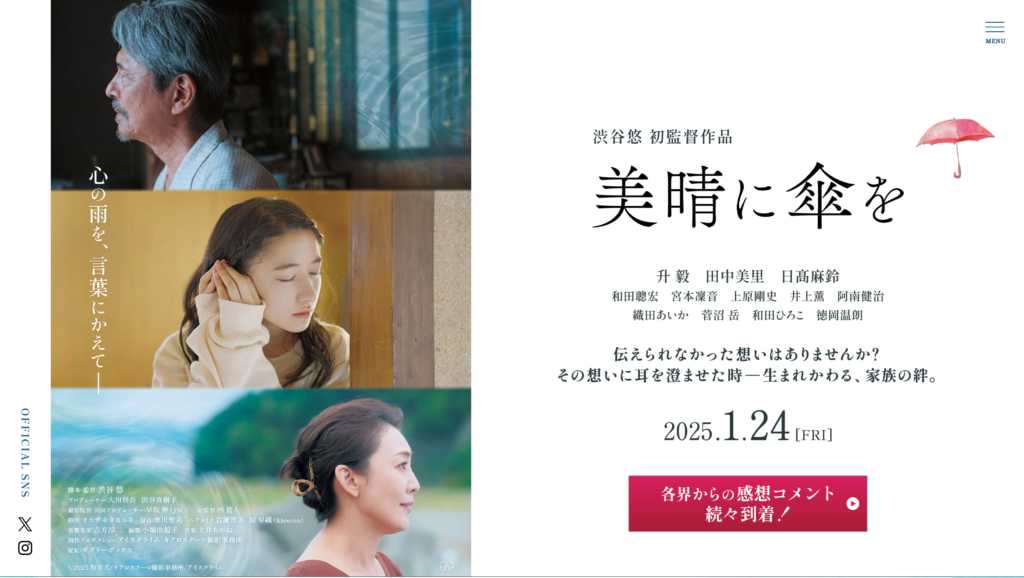 この映画のラストシーンには涙が溢れる。善次が息子に語りかけるその後悔の言葉と演技、そして母親の娘たち対する思いを亡き夫に「お父さん、孫たちをおじいさんに会わせることができたよ!」と浜辺で叫ぶ。聴覚障害のある姉の美晴、一歩一歩進んで成長し、そしてクライマックスは「傘をさしながら雨の中、傘が離れていき雨に打たれながらも喜びに溢れるシーン」。そうなのだ!それぞれの「傘」に受け止め方もいろいろあるのだ。