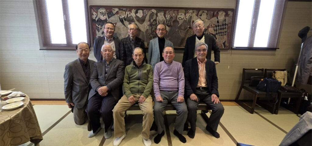 今回の同期会にはアクティブシニアとして元気な9人が集まった。福岡市内に在住しているO君、N君、遠くは長崎の大村市からU君、大分の中津市からK君、熊本の南阿蘇からM君、北九州から幹事のH君とM君、下関市からO君、宇部市から私の参集である。